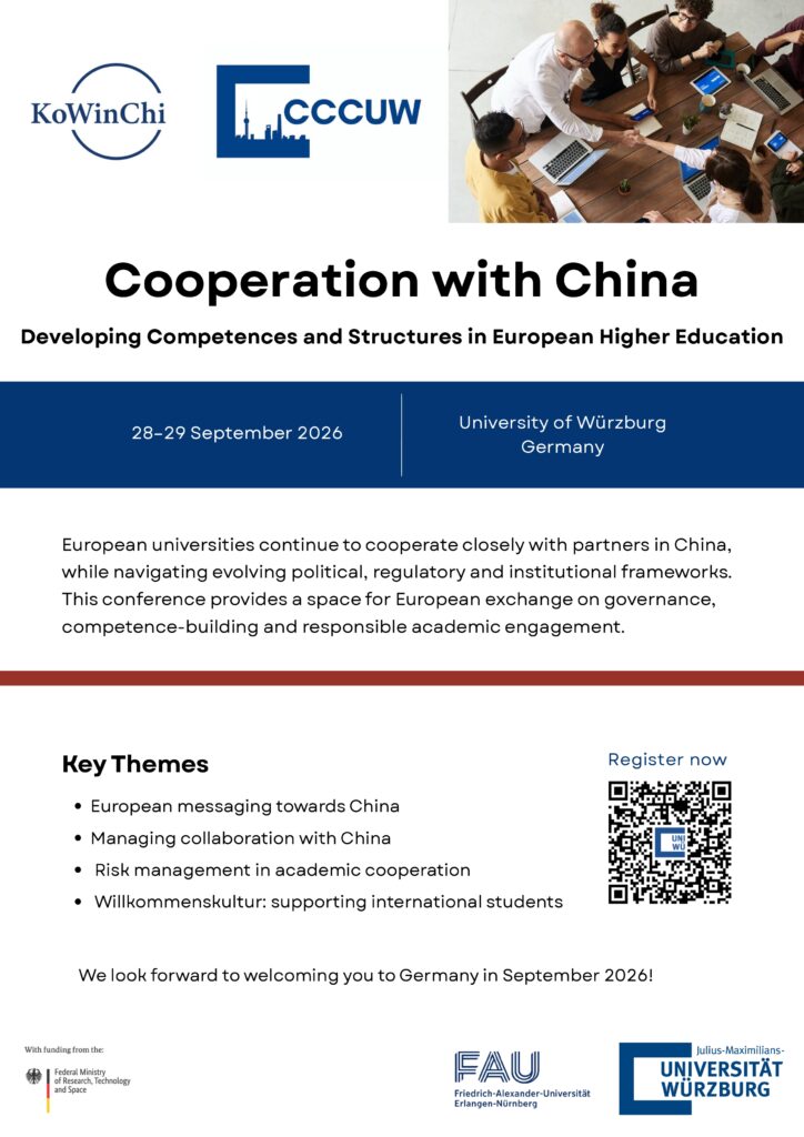 Against this backdrop, the China Competence Centre of the University of Würzburg and the KoWinChi project (Interacting Competently with China in Science) — a joint programme of the University of Würzburg and FAU Erlangen-Nürnberg, funded by the German Federal Ministry of Research, Technology and Space — invite participants from across Europe to exchange experiences and reflect together on institutional approaches to cooperation with China.