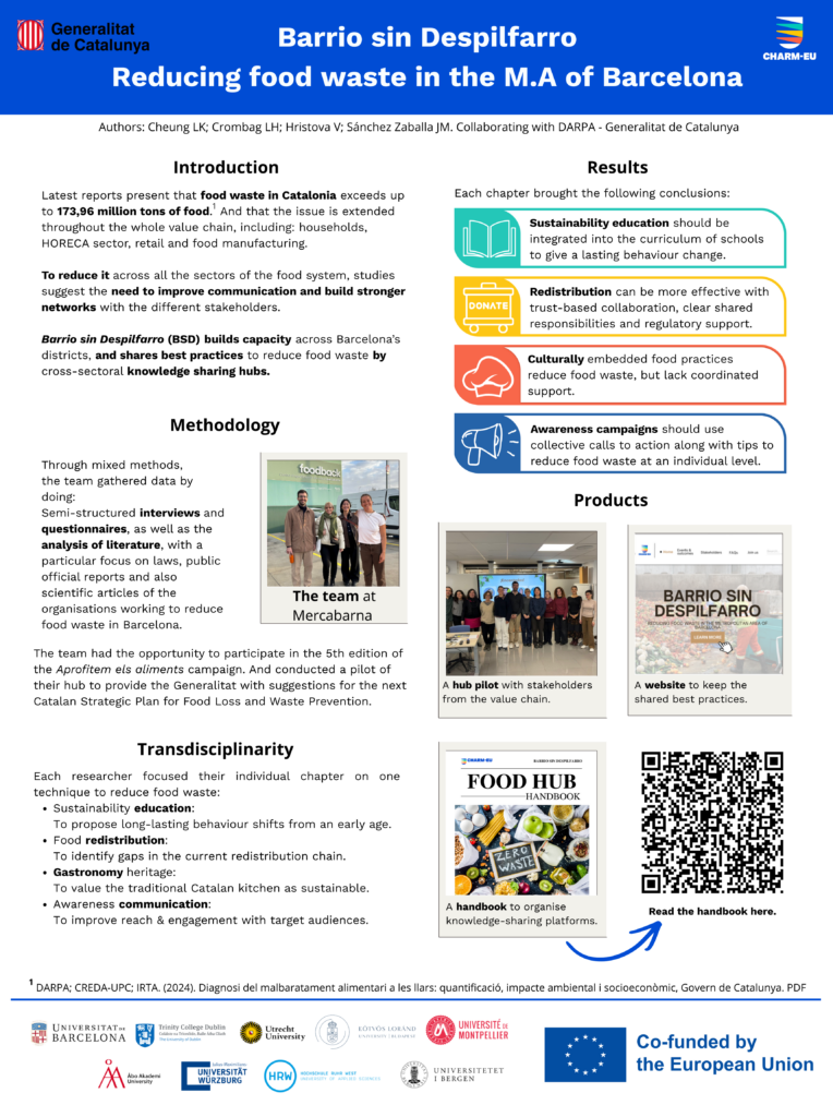 Food Waste poses a risk to the environment, economy, and society, as it accounts for around 16% of the European food system gas emissions, costs €130 billion per year in the EU and puts over 42 European citizens at risk of food insecurity. Thereafter, action is needed to reduce such an issue across all the sectors of the food chain. That is why, in collaboration with the regional Government of Catalonia (Spain), this project has been proposed to immediately reduce food waste through knowledge transfer spaces and indirectly strengthen the capacity of the food supply chain actors in the Metropolitan Area of Barcelona, through community building. The project is meant to work as a prototype for the improvement of the next Catalan Strategy for food waste and loss reduction.