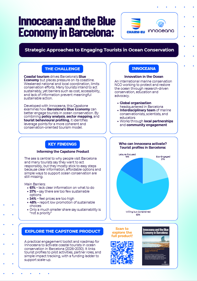 This capstone challenge examines how Innoceana can support Barcelona’s Blue Economy ecosystem by transforming coastal tourism into an active driver of ocean conservation.